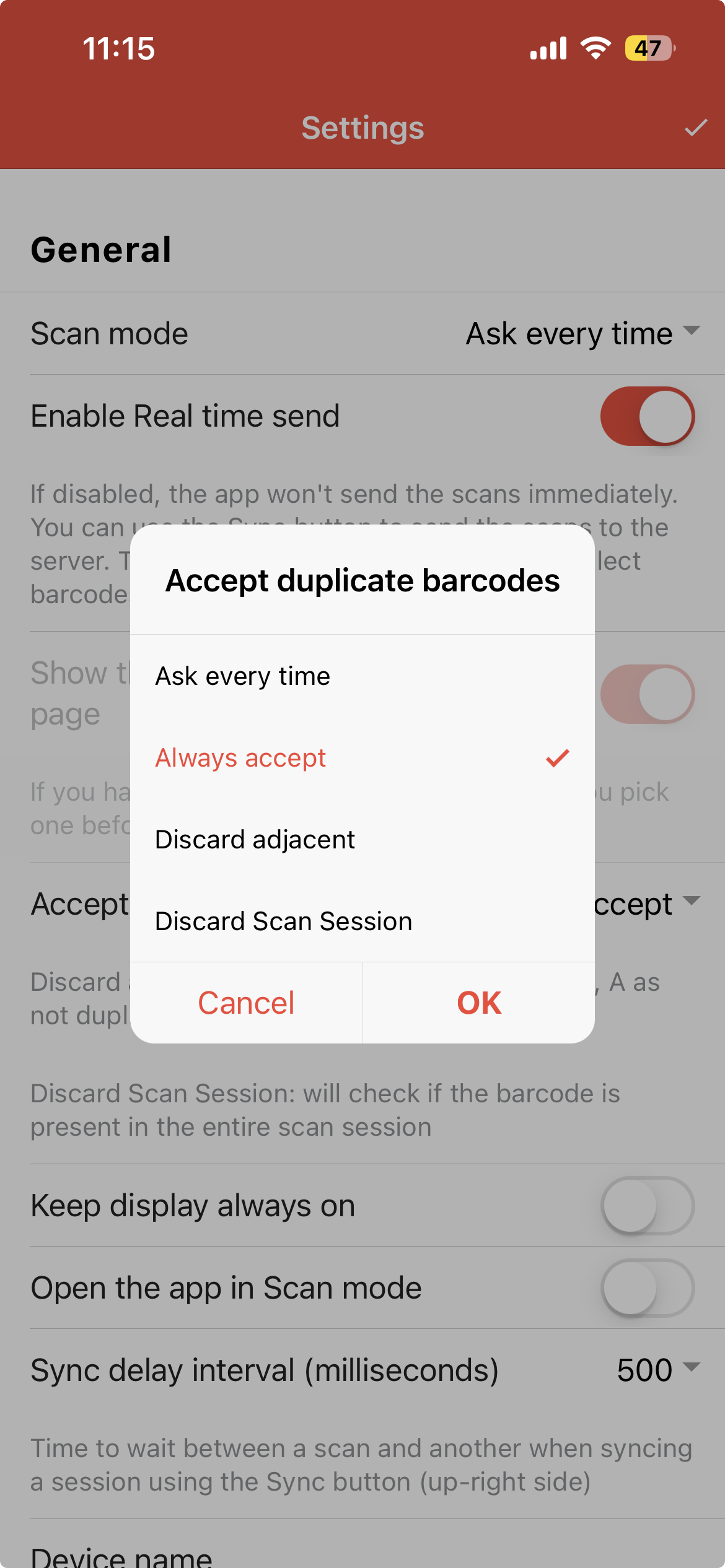 In the mobile app go to: Settings → Accept duplicate barcodes and pick the behavior that matches your workflow: